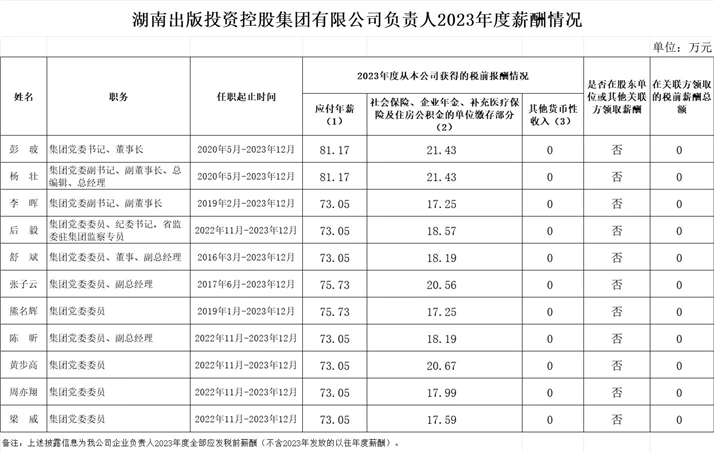 湖南出版投資控股集團有限公司負責(zé)人2023年度薪酬公示