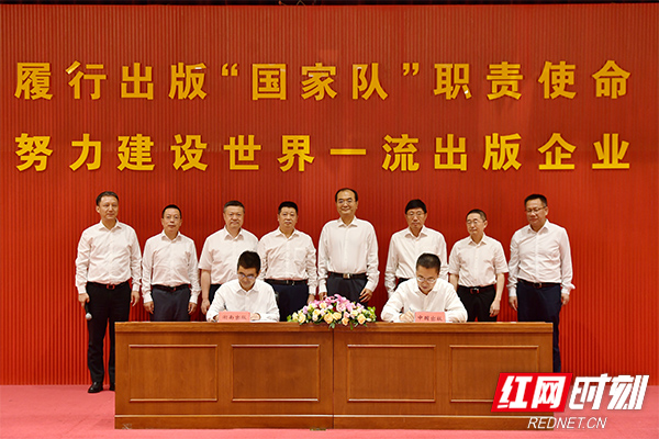 中國出版集團黨組成員、副總經理陳永剛,中國出版集團黨組成員、中國出版?zhèn)髅焦煞萦邢薰靖笨偨浝砻┰荷?,湖南出版集團黨委書記、董事長彭玻,湖南出版集團黨委副書記、副董事長、總編輯、總經理楊壯,湖南出版集團黨委委員、分管日常工作的副總經理舒斌出席簽約協(xié)議。